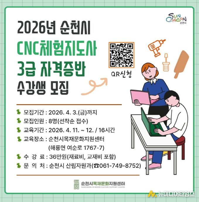 순천시는 오는 4월 3일까지 ‘2026년 CNC체험지도사 3급 자격증반’ 교육생을 모집한다고 밝혔다.