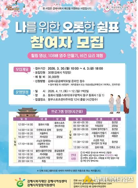 참여자 모집은 3월 30일부터 4월 3일까지 진행되며, 김해시공공예약포털을 통해 온라인으로 접수할 수 있다.