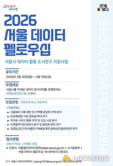 시는 3월 30일부터 4월 19일까지 ‘2026 서울 데이터 펠로우십’ 참여자를 모집하고, 대학원생 등 청년 분석 인재를 중심으로 도시문제 해결 프로젝트를 추진한다고 밝혔다.