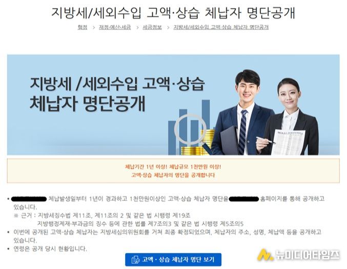 명단공개 대상은 납부 능력이 있음에도 납부하지 않거나 납부 약속을 이행하지 않은 납세기피자를 중심으로 선정했으며 무재산·거주불명 상태라도 부동산이나 자동차 등 압류 가능 재산이 있는 경우도 포함된다.