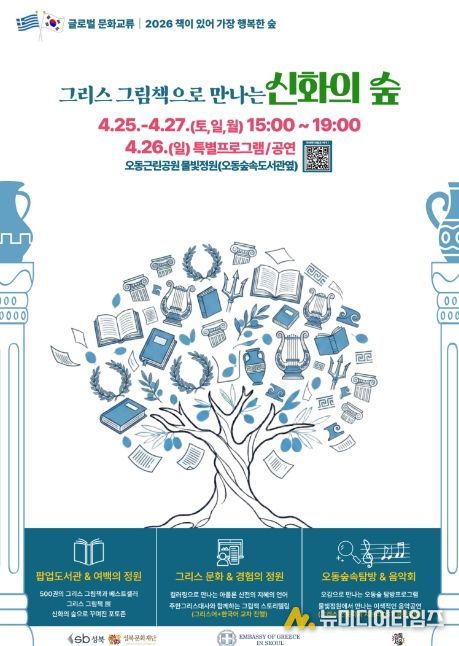 행사장 전역에는 ▲500여 권의 도서를 갖춘 ‘팝업도서관’ ▲숲속에서 감상하는 ‘그리스 그림책展’ ▲신화 속 장면을 재현한 ‘포토존’이 운영된다. 특히 고대 그리스 아폴론 신전의 델픽 격언을 배우는 ‘지혜의 언어 컬러링’과 ‘그리스 알파벳 스탬프 체험’은 어린이들이 고대 그리스 문화를 친숙하게 접할 수 있는 기회를 제공할 예정이다.