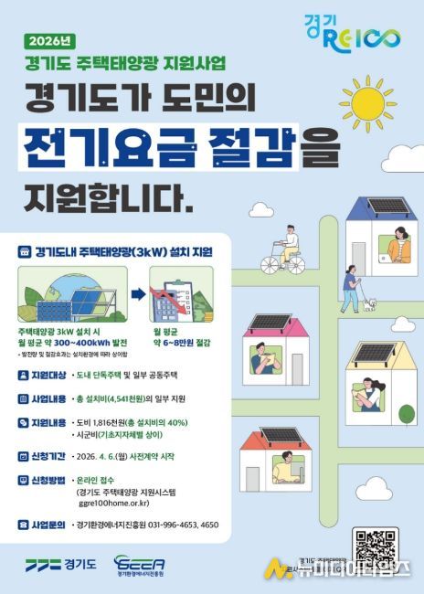 경기도가 주택태양광 설치비의 약 60%를 지원하는 ‘2026 경기도 주택태양광 지원사업’ 참여자를 모집한다고 30일 밝혔다. 모집규모는 총 1,520가구다.