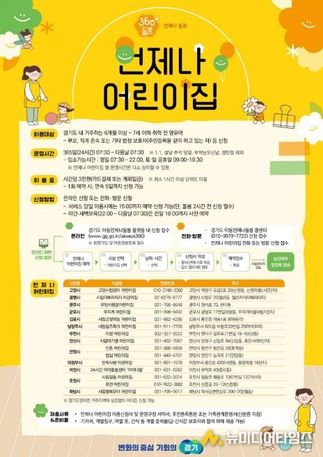 3월 현재 도내 13개 시군 15개소를 운영 중인 ‘언제나 어린이집’은 365일 24시간 운영되는 긴급·일시 보육 서비스를 제공하는 시설이다. 경기도에 거주하는 영유아(6개월 이상 7세 이하 취학 전)를 둔 보호자라면 가정에서 자녀를 양육하더라도, 어린이집이나 유치원을 다니더라도, ‘언제나 어린이집’과 거주지역이 달라도 제한 없이 누구나 이용할 수 있다.