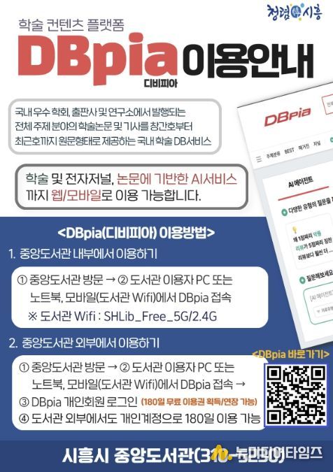 시흥시중앙도서관은 시민들의 연구·학습 활동을 적극 지원하고 지식정보 접근성을 높이기 위해 국내 대표 학술 콘텐츠 플랫폼인 ‘디비피아(DBpia)’ 이용 서비스를 지난 3월 27일부터 시작했다.