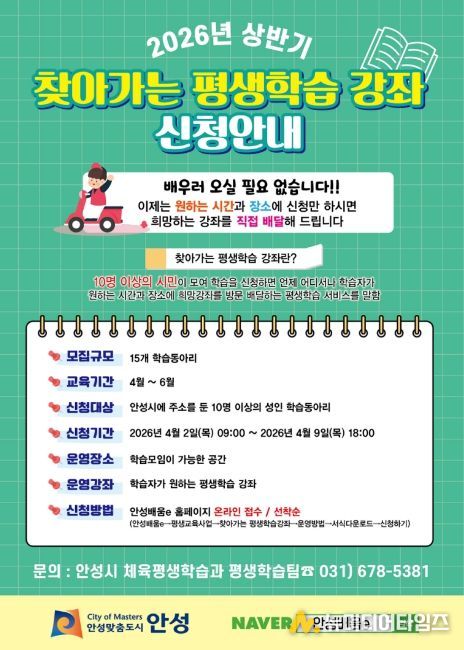 안성시는 시민이 원하는 시간과 장소에서 희망하는 강좌를 수강할 수 있는 '2026년 상반기 찾아가는 평생학습 강좌'를 운영한다고 밝혔다.