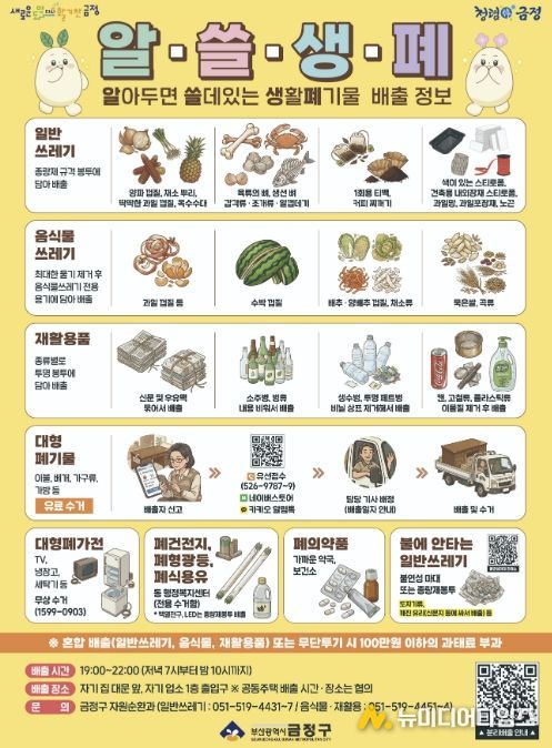 부산 금정구는 생활폐기물 배출에 대한 주민 불편을 해소하고 올바른 분리배출 문화 정착을 위해 ‘알‧쓸‧생‧폐’(알아두면 쓸데 있는 생활폐기물 배출 정보) 홍보지 제작에 나선다고 밝혔다.