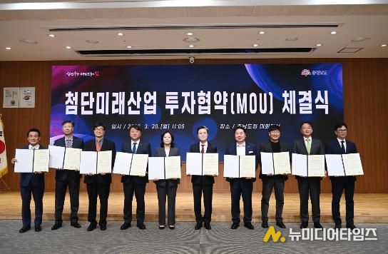 김태흠 지사는 30일 도청 대회의실에서 오세현 아산시장 등 3개 시군 시장·군수, 김동회 디앤알파트너스 대표이사 등 6개 기업 대표와 투자협약(MOU)를 체결했다.