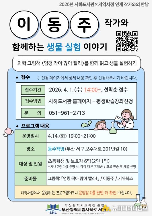 프로그램은 과학 그림책 ‘엄청 작아 많아 빨라!’를 함께 읽고, 가족이 함께 생물을 실험하고 관찰하는 체험 중심 활동으로 진행된다. 이를 통해 어린이와 보호자가 함께 책을 매개로 소통하며 과학적 호기심을 키우는 기회를 제공할 예정이다.