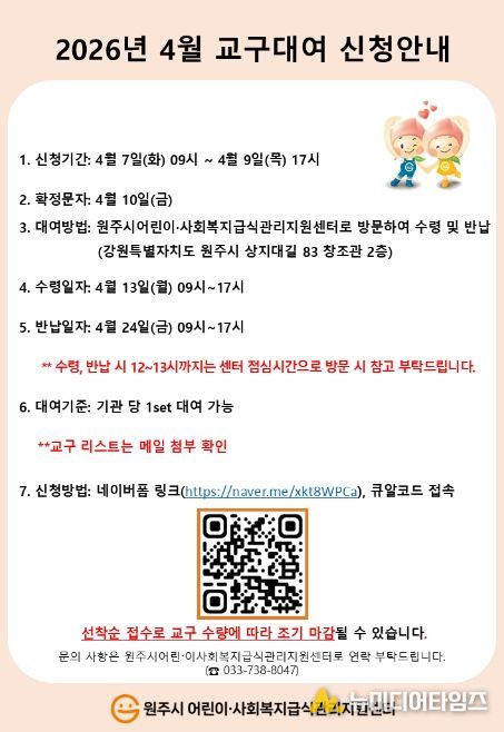 원주시어린이·사회복지급식관리지원센터는 2026년 ‘어린이 교구 대여 사업’을 실시한다.