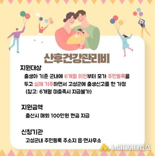 이번 사업은 산후 건강관리가 필요한 산모들에게 실질적인 경제적 혜택을 제공함으로써 안정적인 양육 환경을 조성하고, 고성군 내 행복한 출산 문화를 확산시키는 데 목적을 두고 있다.