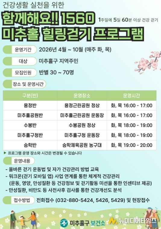 인천 미추홀구는 지역 주민의 신체활동 실천율을 높이고 비만 등 만성질환을 예방하기 위해 ‘2026년 함께해요! 1560 미추홀 힐링 걷기’를 오는 4월부터 본격 운영한다고 밝혔다.
