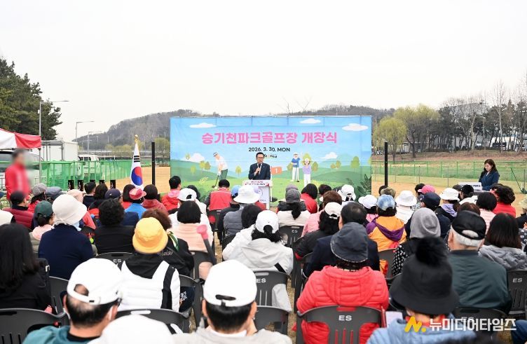승기천의 수려한 자연경관을 배경으로 조성된 이번 파크골프장은 고령화 시대 새로운 국민 스포츠로 각광받는 파크골프 수요에 부응하기 위해 마련됐다.