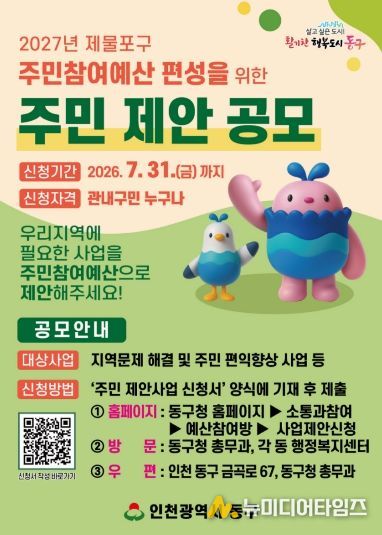 인천 동구는‘2027년 주민참여예산’제안 사업 공모를 오는 7월까지 진행한다고 밝혔다.
