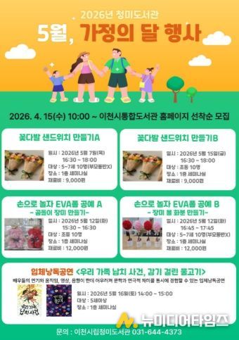 이천시 청미도서관은 5월 가정의 달을 맞아 오는 5월 7일부터 5월 16일까지 어린이들을 위한 체험 프로그램과 가족들을 위한 입체낭독공연을 운영한다.