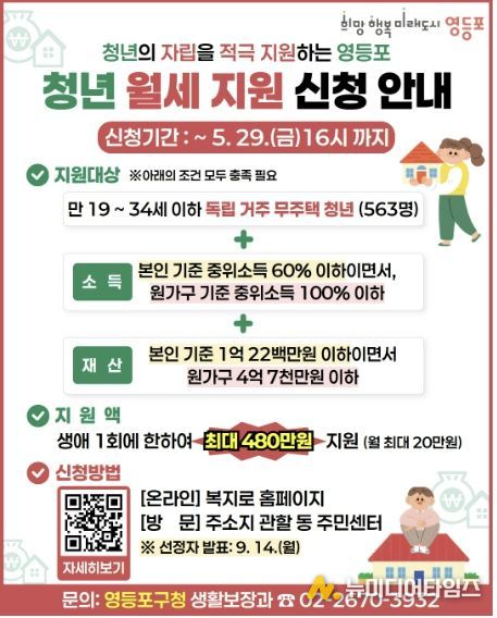 영등포구 생활보장과장은 “주거비 부담으로 어려움을 겪는 청년들에게 도움이 되길 바란다”라며 “지원 요건을 충분히 확인해 신청 기회를 놓치지 않길 바란다”라고 전했다.