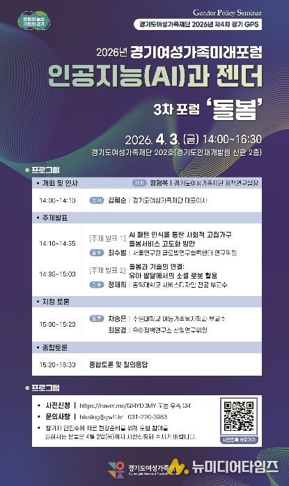 경기도여성가족재단은 3일 재단 회의실에서 ‘인공지능과 돌봄’을 주제로 경기여성가족미래포럼을 개최한다. 3월부터 5월까지 총 5차례 진행하는 경기여성가족미래포럼 중 이번이 3회차다.