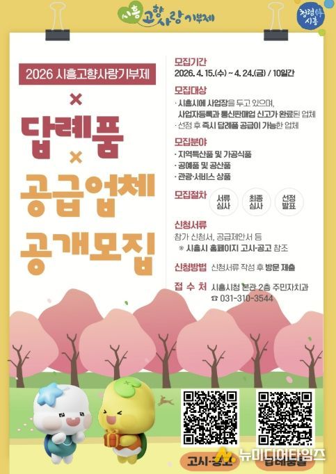 시흥시는 고향사랑기부제 활성화와 지역 특색을 반영한 답례품 발굴을 위해 ‘2026년 고향사랑기부제 답례품 및 공급업체’를 공개 모집하며 4월 15일부터 24일까지 10일간 신청ㆍ접수를 받는다.