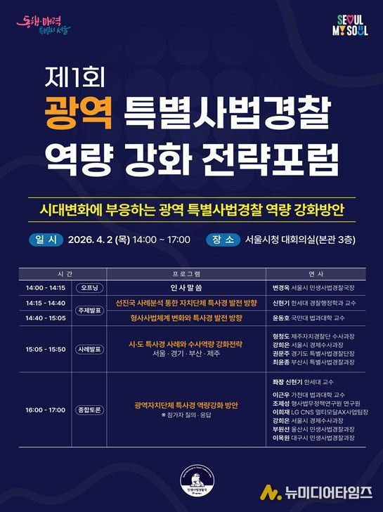서울시가 2일 오후 2시에 서울시청 대회의실에서'제1회 광역 특별사법경찰 역량 강화 전략포럼'을 개최한다. 관련 연구자와 함께 시‧도 특사경 전담부서장 등이 참석해 해외사례와 현장 노하우 등을 공유하고 광역 특사경 발전방향을 모색한다.