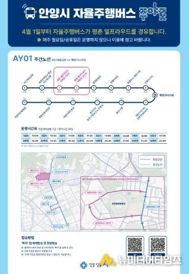 한편, 안양시 자율주행 버스 ‘주야로’는 심야 시간대 교통 편의를 위해 야간 노선도 운영 중이다. 야간 노선(노선 번호 'AY02')은 인덕원역·범계역·안양역을 연결하며, 대중교통 취약 시간대인 자정부터 오전 2시 30분까지 기존대로 운행한다.