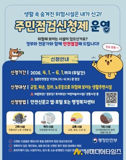 이번 제도는 2026년 집중안전점검 기간(4월 20일~6월 19일)에 맞춰 추진되는 것으로, 점검 대상을 주민들이 직접 선정함으로써 시민들의 안전의식을 높이고, 시설 노후화 등으로 인한 사고를 예방하는 것을 목표로 한다.