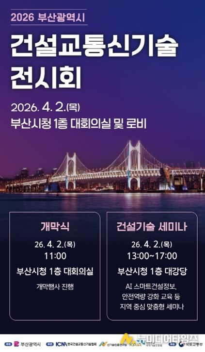 부산시는 우수 건설 신기술 홍보와 활용을 촉진하고 지역 중소기업의 성장동력을 지원하기 위해 오늘(2일) 오전 10시부터 오후 5시까지 시청 1층 대회의실과 로비에서 '2026년 부산광역시 건설교통신기술 전시회'를 개최한다고 밝혔다.