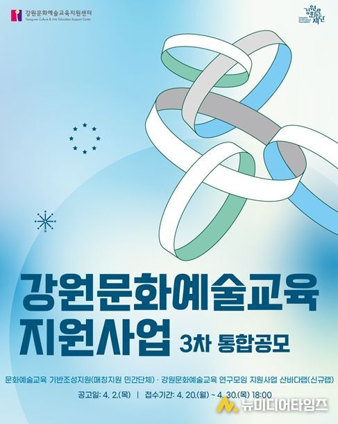 강원문화재단은 도내 문화예술교육 기반 확대와 현장 중심 연구 활성화를 위한 '2026년 강원문화예술교육 지원사업 3차 통합 공모'를 진행한다.