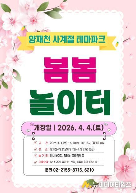 전성수 서초구청장은 “겨울철 눈썰매장으로 운영되던 양재천 공간을 봄철에는 온 가족이 즐길 수 있는 놀이공간으로 조성했다”며 “계절마다 다양한 즐길거리를 제공하는 양재천에 많은 가족들이 방문해 즐거운 시간을 보내길 바란다”고 말했다.