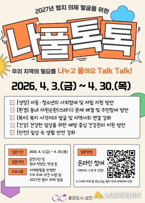 금천구는 4월 3일부터 30일까지 온라인 플랫폼을 통해 주민 참여형 공론장인 ‘나풀톡톡(나누고 풀어요 Talk Talk)’을 운영한다고 밝혔다.