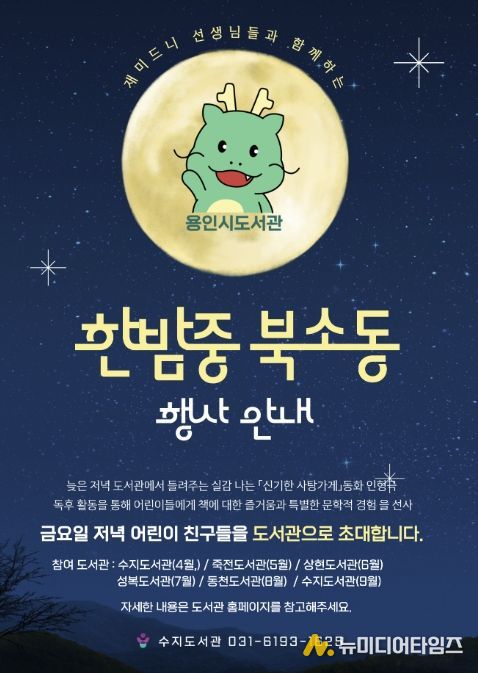 용인특례시 서부도서관은 수지‧죽전‧상현‧성복‧동천도서관에서 야간 독서문화 프로그램 ‘한밤중 북소동’을 운영한다고 25일 밝혔다.