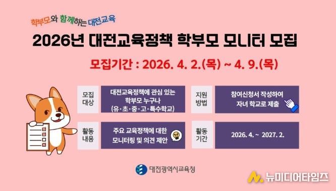대전시교육청은 2026년 대전 교육 정책 학부모 모니터를 4월 2일부터 9일까지 각급 학교 학부모를 대상으로 모집한다고 밝혔다.
