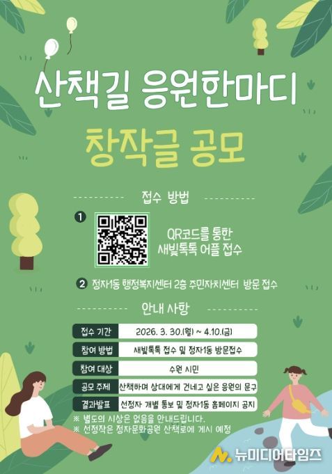 수원시 장안구 정자1동은 2026년 주민참여예산 사업인 '아름다운 글귀가 있는 거리 조성' 추진에 따라 정자문화공원 산책로에 설치할 ‘산책길 응원 한마디’ 표지판 창작글을 공모한다고 밝혔다.