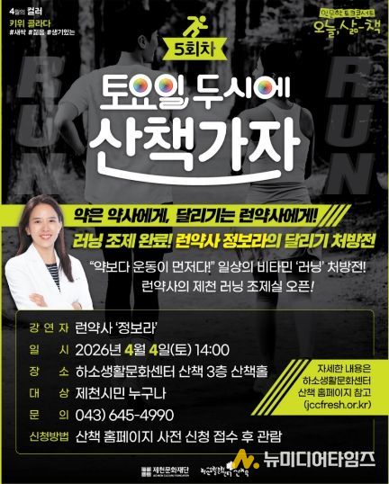 (재)제천문화재단은 오는 4일 오후 2시 하소생활문화센터 산책에서 ‘토요일 두 시에 산책가자! 런약사 정보라의 달리기 처방전’ 인문학 토크콘서트를 개최한다고 밝혔다.