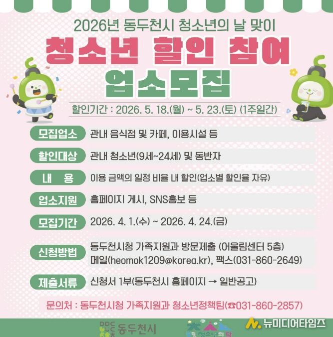 이번 ‘청소년 할인 주간’은 동두천시에 거주하는 청소년(9세~24세)과 동반 보호자를 대상으로 진행하며, 참여 업소에서 자율적으로 정한 할인 혜택(10~30% 할인 또는 증정 서비스 등)을 받을 수 있다.