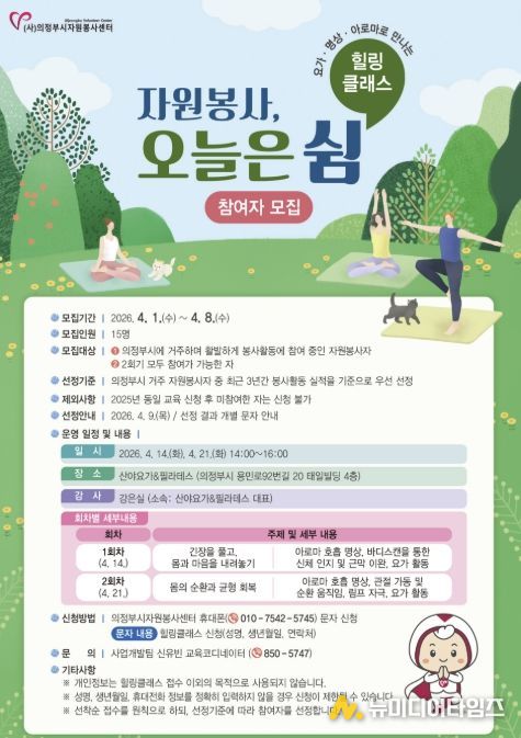의정부시자원봉사센터는 4월 1일부터 4월 8일까지 자원봉사자들의 지속 가능한 자원봉사 활동 활성화를 위해 지친 몸과 마음을 회복하는 요가·명상·아로마로 만나는 힐링 클래스'자원봉사, 오늘은 쉼'참여자를 모집한다.
