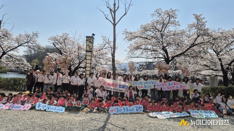 이번 캠페인에는 김천시립어린이집 6개소(모암, 개령, 센트럴자이, 율곡, 지례, 아포)의 원생 및 보육교사 120여 명이 참여해 벚꽃 명소인 연화지 산책로를 따라 이동하며 시민들을 대상으로 출산과 육아의 소중함을 전달했다.