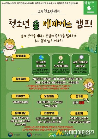 이번 캠프는 국립춘천숲체원에서 초등 4~6학년 연령의 청소년 40명을 대상으로 진행할 예정이다. 주요 프로그램은 ▲탄소중립 알아보기, ▲탄소를 먹고 자라는 숲, 수토리, ▲포레스트 가디언즈 등 흥미로운 체험 활동이 운영된다.