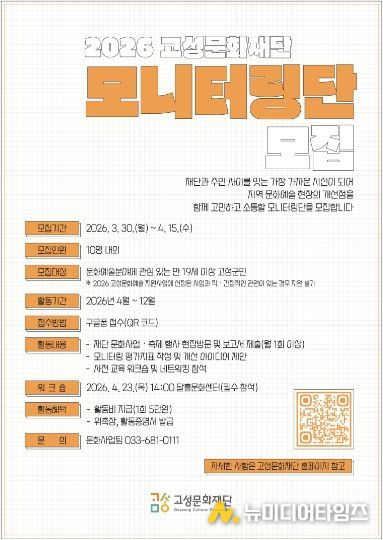 평화 경제 거점 도시 강원 고성군 산하 고성문화재단은 재단이 추진하는 문화예술사업에 대한 군민 의견을 반영하고 사업 환류 체계를 강화하기 위해 ‘2026 고성문화재단 모니터링단’을 모집한다. 이번 사업은 군민 참여 기반의 현장 소통을 확대하고, 문화예술사업 운영의 투명성과 책임성을 높이기 위해 마련됐다.