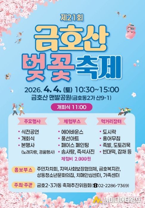 서울 성동구 금호2-3가동은 오는 4월 4일 금호산 맨발공원에서 ‘금호산 벚꽃축제’를 개최한다고 밝혔다.