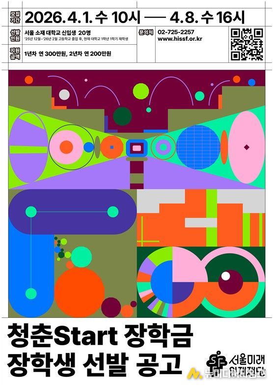 서울미래인재재단이 ㈜두산 임직원 기부금으로 14년째 운영 중인 '청춘Start장학금' 14기 장학생 20명을 모집한다. 서울 소재 대학에 올해 입학한 저소득 신입생을 대상으로 2년간 총 500만 원의 학업장려금을 지급하며, 신청은 4월 8일 16시까지 재단 누리집에서 받는다.