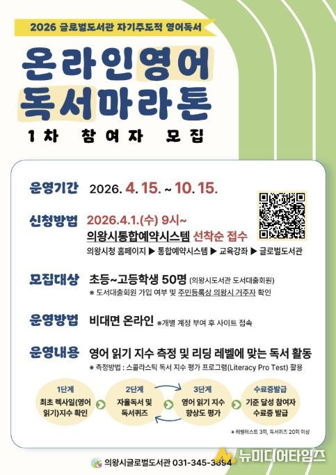 의왕시 글로벌도서관은 학생들의 영어 독서 흥미를 높이고 자기주도적 학습 습관 형성을 지원하기 위해 기획된 '온라인 영어독서마라톤'의 1차 참여자 50명을 모집하고 있다.