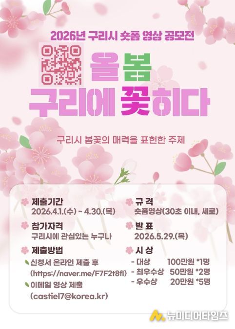 구리시는 올해 새롭게 시작하는 봄꽃 축제 ‘장자호수 벚꽃마실 축제’를 효과적으로 홍보하고 시민과의 소통을 강화하기 위해 ‘2026 구리시 숏폼 영상 공모전 '올봄, 구리에 꽃히다'’ 접수를 4월 30일까지 진행한다고 밝혔다.