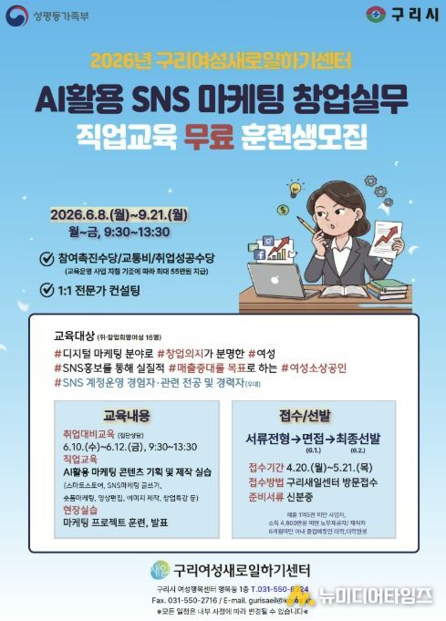 구리시는 구리새일센터에서 여성들의 디지털 마케팅 역량을 강화하고 성공적인 취·창업을 지원하기 위해 ‘AI 활용 SNS 마케팅 창업 실무’ 직업교육훈련 과정의 교육생을 오는 4월 20일부터 모집한다고 밝혔다.