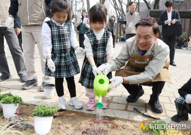 이날 행사에는 기부자와 주민, 어린이, 새마을지회, 강남정원사 등 500여 명이 참여해 산딸나무와 단풍나무 등 교목 94주, 영산홍과 사철나무 등 관목 1,000주를 심고, 초화류 정원과 벤치 등을 함께 조성했다.