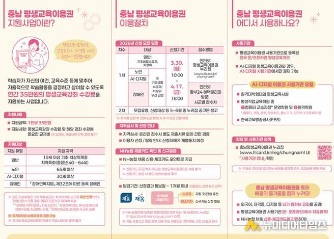 충청남도가 도민의 평생학습 기회 확대와 경제적 여건에 따른 교육격차 완화를 위해 2026년 충남 평생교육이용권 1차 신청·접수를 시작했다.