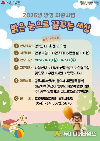 (재)영덕복지재단은 시력 교정이 필요함에도 경제적 어려움으로 안경을 구매하지 못하는 관내 취약 아동‧청소년을 지원하기 위해 6일부터 안경 지원 사업을 펼친다.