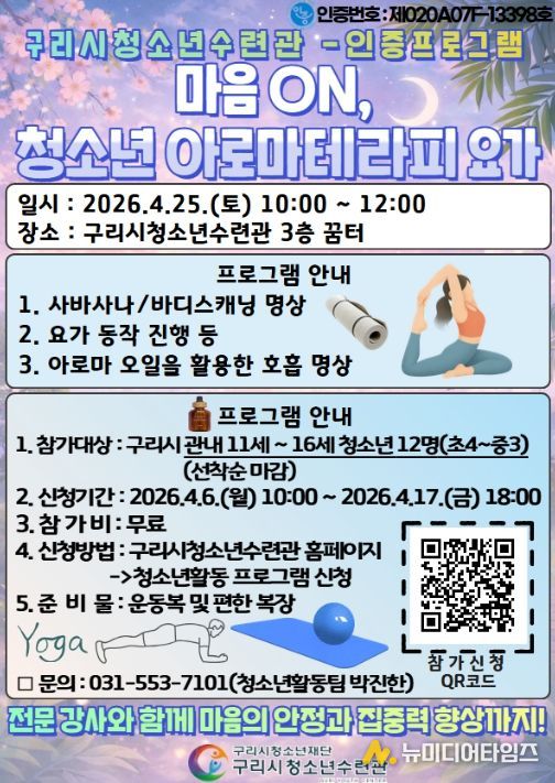 구리시청소년재단 청소년수련관은 ‘마음 ON, 아로마테라피 요가’ 프로그램 참가자를 4월 6일 오전 10시부터 4월 17일 오후 6시까지 모집한다고 밝혔다.