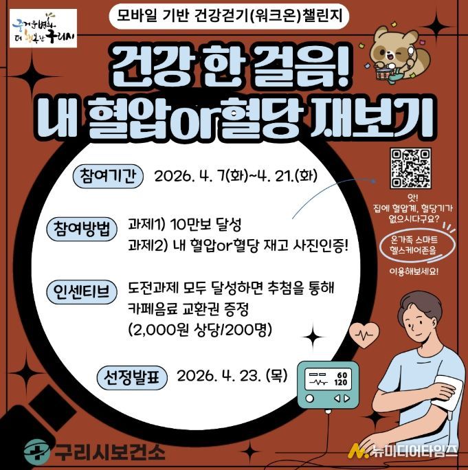 구리시는 시민들의 건강생활 실천을 유도하고 만성질환 예방 관리를 강화하기 위해 ‘건강 한 걸음! 내 혈압·혈당 재보기’ 도전 잇기를 오는 4월 7일부터 21일까지 15일간 운영한다고 밝혔다.