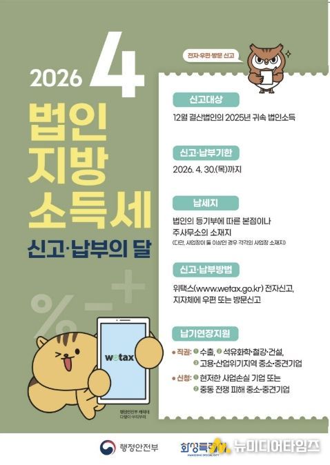 화성특례시가 2025년 귀속 ‘법인지방소득세 집중 신고·납부 기간’을 오는 4월 30일까지 운영한다고 밝혔다.