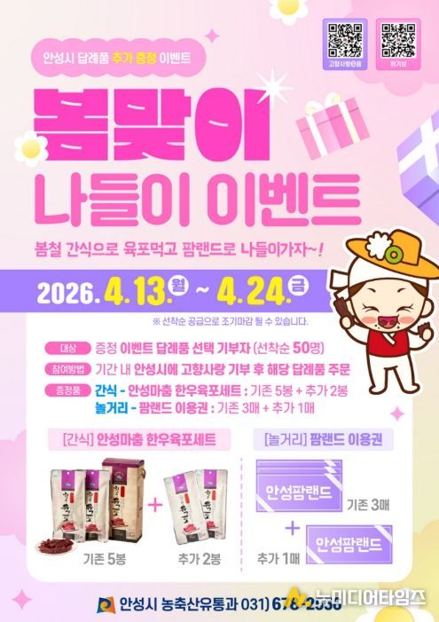 안성시 관계자는 “봄나들이와 어울리는 간식 및 체험형 답례품을 연계해 기부자의 만족도를 높이고자 이번 이벤트를 마련했다”며, “앞으로도 계절별 특색을 살린 다양한 이벤트를 통해 고향사랑기부 참여를 확대해 나가겠다”고 말했다.