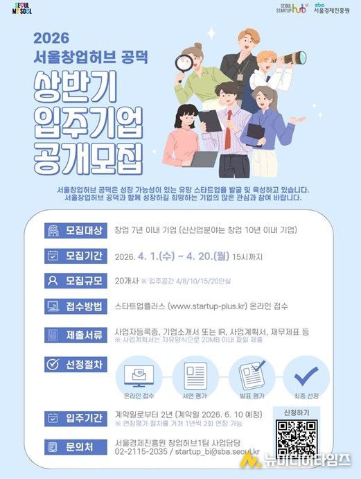 아울러, ‘서울창업허브 성수’에서도 상반기 입주기업 5개사를 모집한다. 성수 허브는 Age-Tech, IT, 문화콘텐츠 등 미래 전략산업 분야를 중심으로 유망 스타트업을 선발하며, 4월 23일까지 접수를 진행한다.